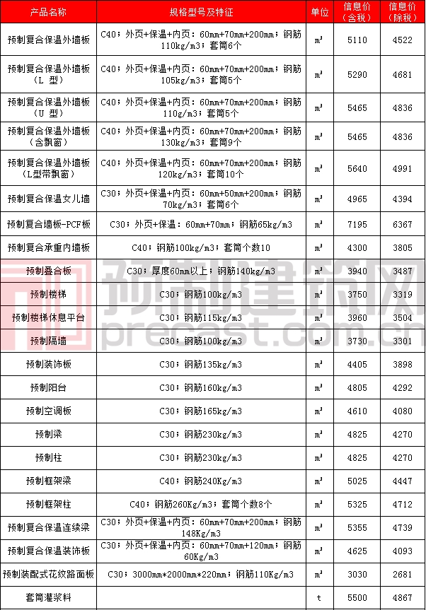 北京市 2020年8月北京鋼筋混凝土預(yù)制構(gòu)件價(jià)格信息 說明: 1.裝配式建筑構(gòu)件模具按正常加工工期考慮,價(jià)格含運(yùn)費(fèi)、構(gòu)件深化設(shè)計(jì)費(fèi),不含卸車費(fèi)、安裝費(fèi),構(gòu)件計(jì)量單位按構(gòu)件體積計(jì)算,構(gòu)件均不帶裝飾面層,保溫材料未單獨(dú)標(biāo)明的均指 XPS 改性擠塑板(導(dǎo)熱系數(shù)≤0.024),其它標(biāo)號混凝土構(gòu)件價(jià)差參考預(yù)拌普通混凝土價(jià)差, 鋼筋含量不同可按實(shí)際鋼筋含...